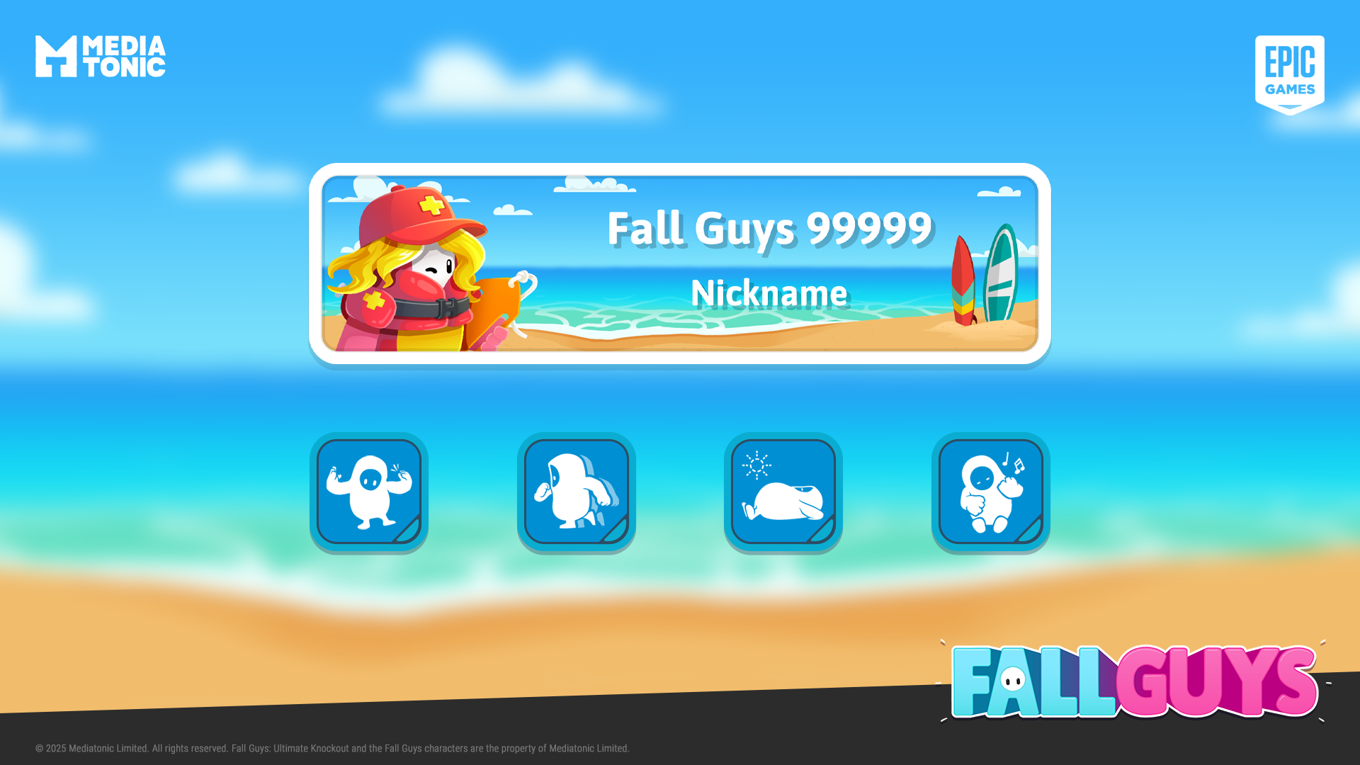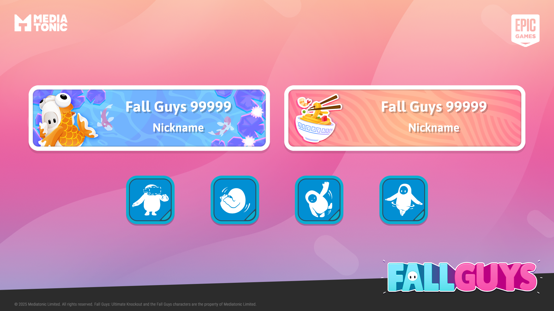 In 2024/2025 I joined the wonderful team at Mediatonic and Epic Games to support them with seasonal UI content updates for Fall Guys. My work has included emote icons, nameplates, decals, and screen mockups for Fame Passes and Live Events.